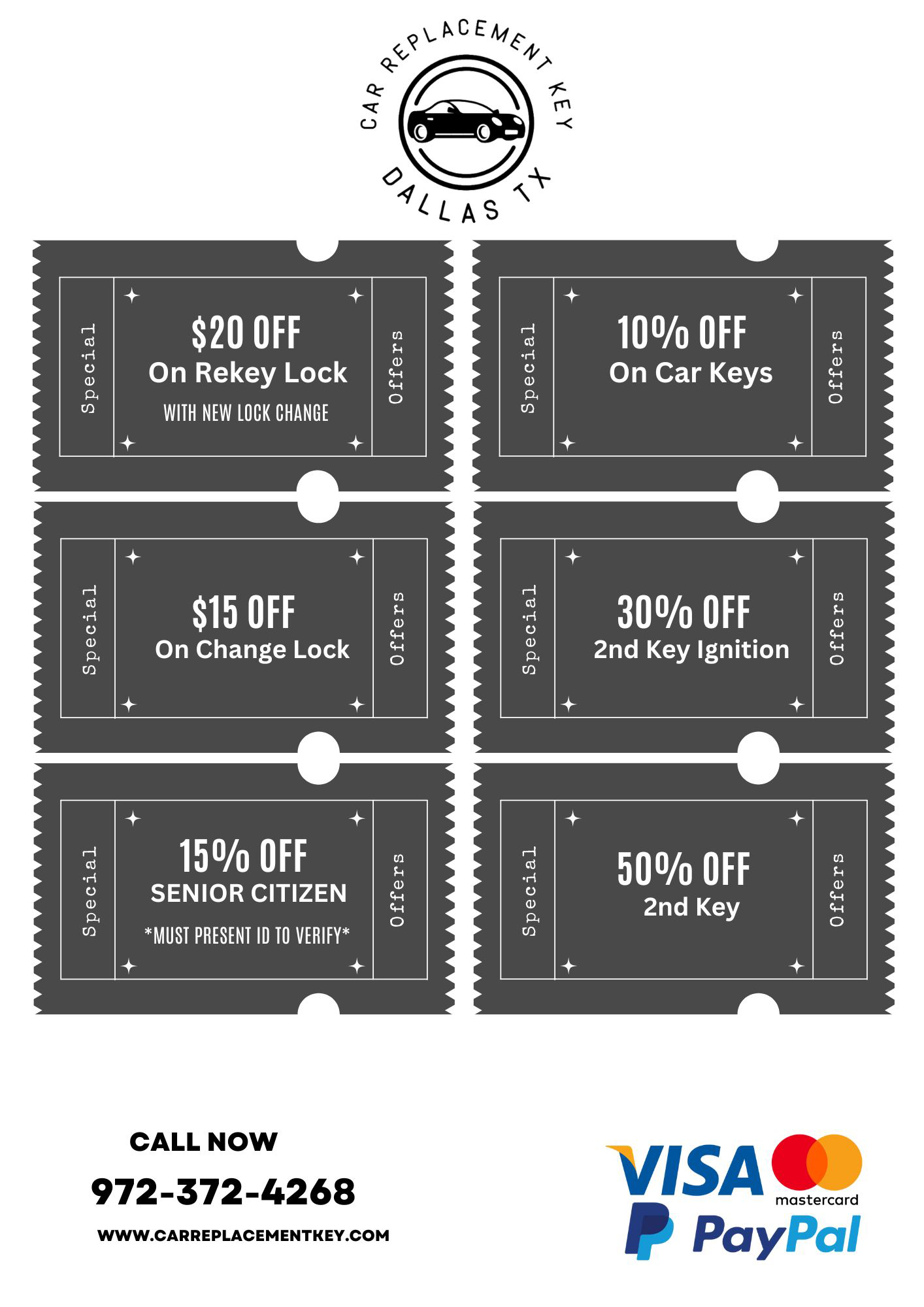 Whether you need a key replacement, key fob programming, or emergency locksmith assistance, our special offers will help you save money while getting the high-quality service you deserve.